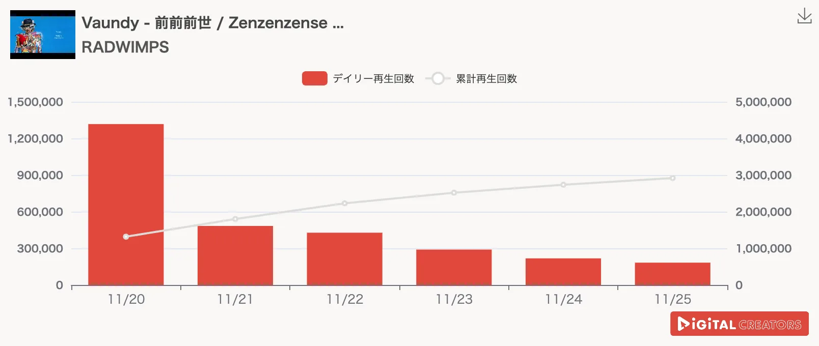 2位に引き続き、RADWIMPS(以下、RAD)のトリビュートアルバムから、シンガーソングライター・Vaundyがカバーした「前前前世」が3位にランクイン。