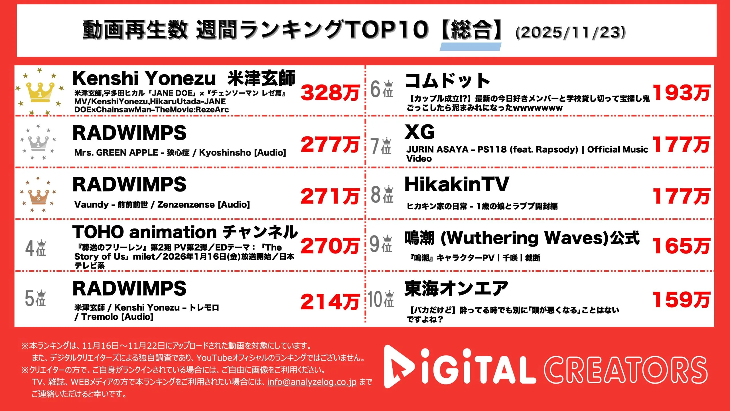 今回は11月16日~11月22日にYouTubeで公開された動画ランキングの総合TOP10を発表。(11月23日集計)。