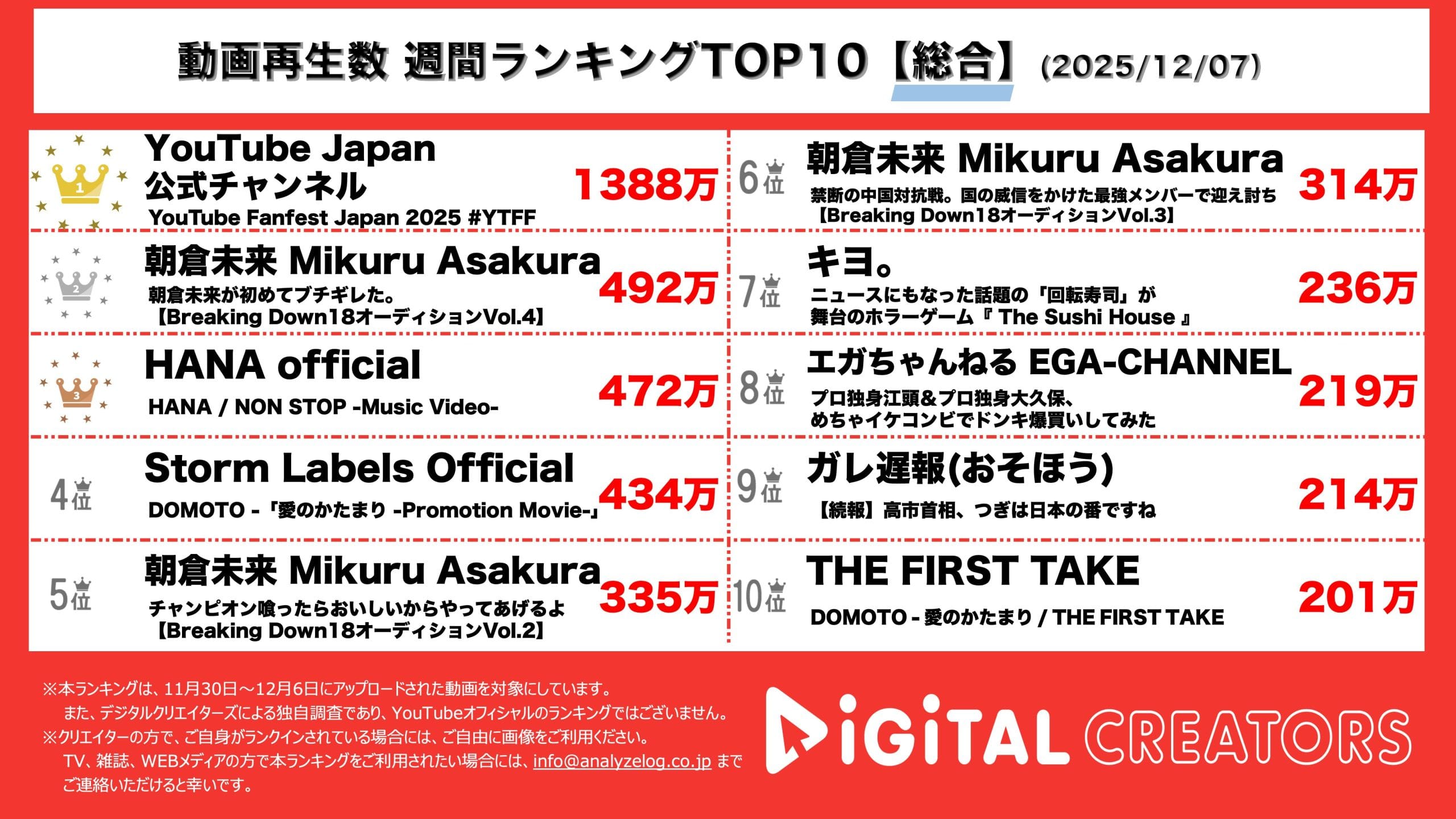 今回は11月30日~12月6日にYouTubeで公開された動画ランキングTOP10を発表。(12月7日集計)