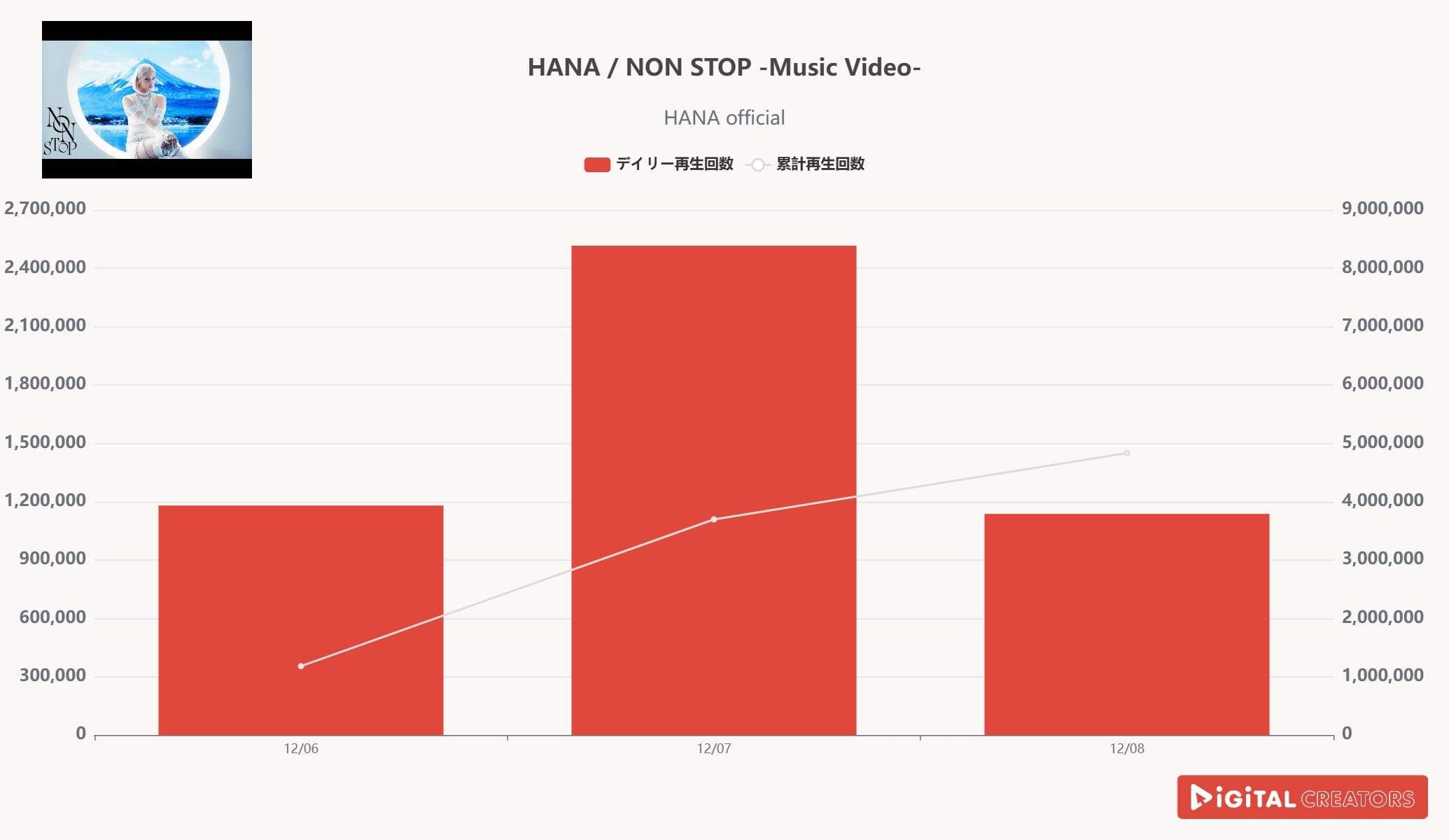 3位を獲得したのは『HANA Official』。12月5日にリリースされた新曲「NON STOP」のMVが公開された。