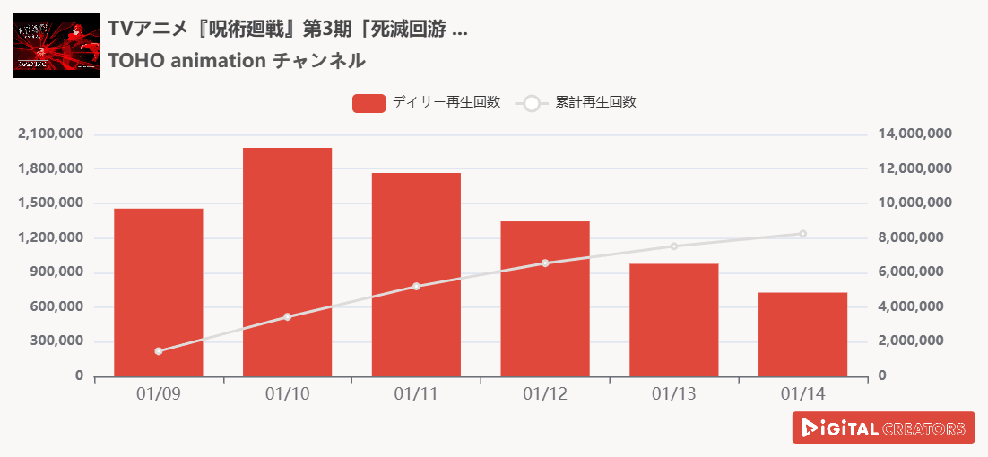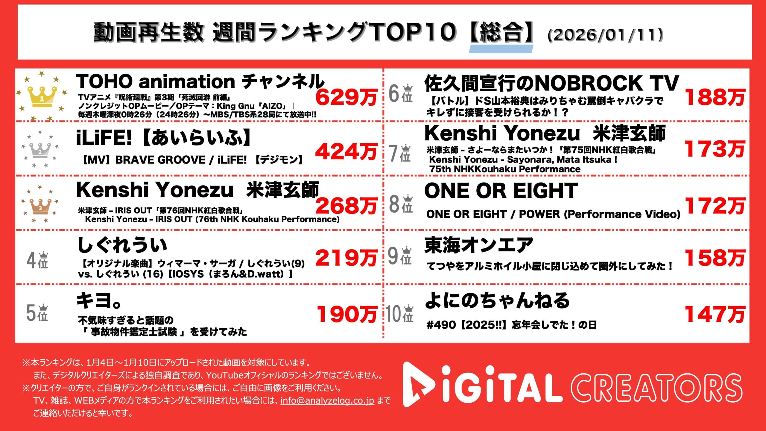 週間YouTube総合動画再生回数ランキングを発表! 「呪術廻戦」第3期「死滅回游 前編」ノンクレジットOPムービー公開‼iLiFE!新曲「BRAVE GROOVE」MV公開‼米津玄師、紅白歌合戦パフォーマンス映像公開‼