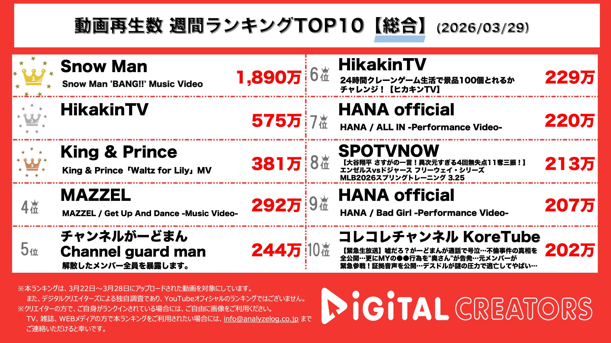 今回は3月22日~3月28日にYouTubeで公開された動画ランキングの総合TOP10を発表。(3月29日集計)