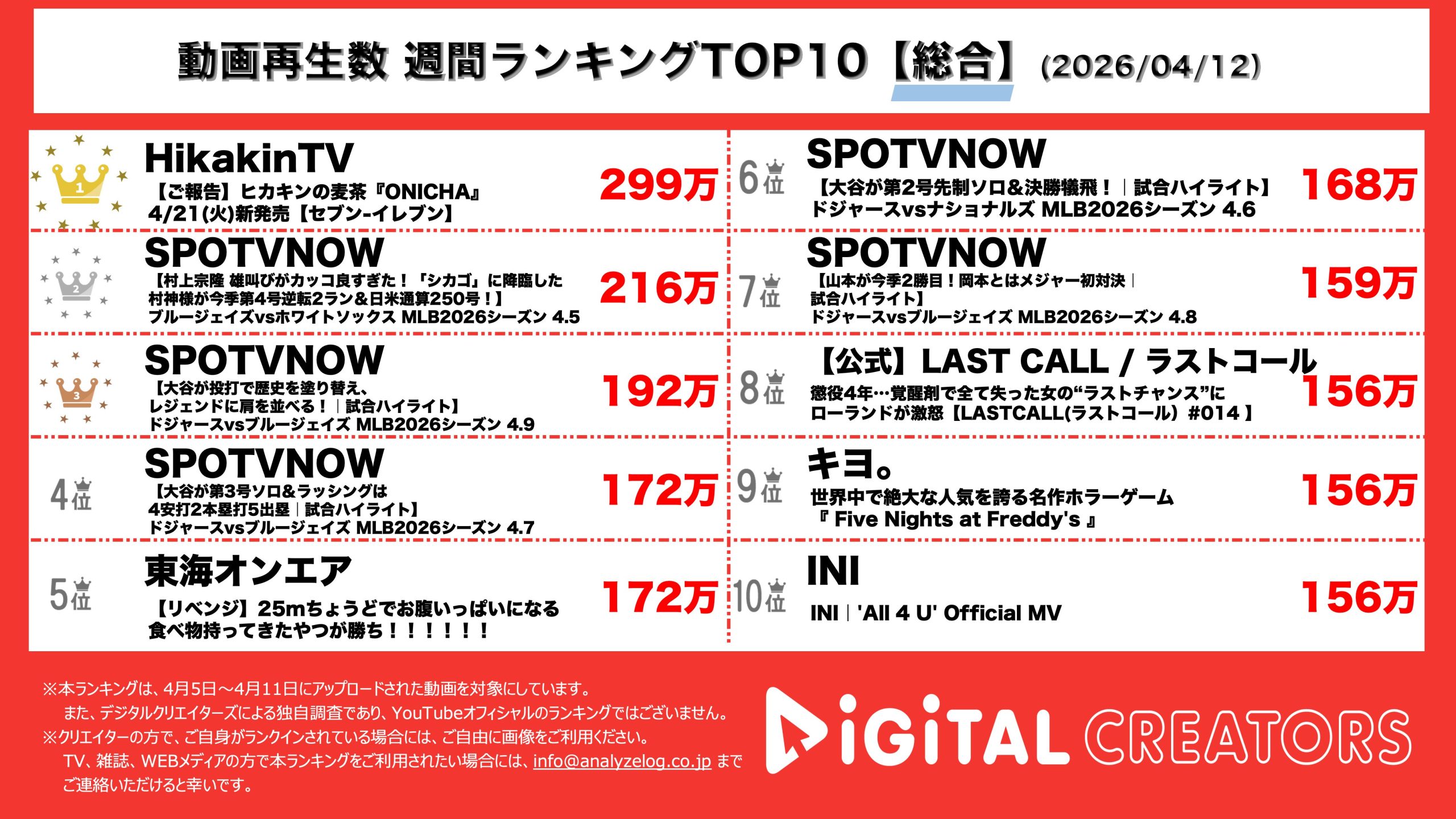 今回は4月5日~4月11日にYouTubeで公開された動画ランキングの総合TOP10を発表。(3月23日集計)