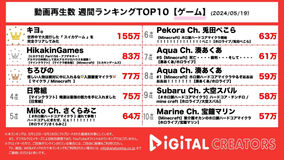 また、5位~10位は『さくらみこ』『兎田ぺこら』『湊あくあ』『大空スバル』『宝鐘マリン』とホロライブ所属のVTuber達のマインクラフト生配信がランクインした。