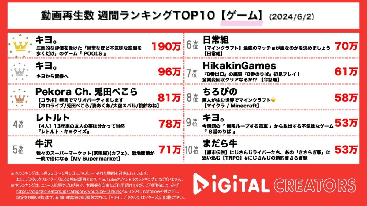 また、今回はランキングに上がった10本の動画のうち3本がキヨという結果に。9位のキヨの動画は6/1の夜に上がったものであるが、わずか1日で再生回数53万回を達成している。
