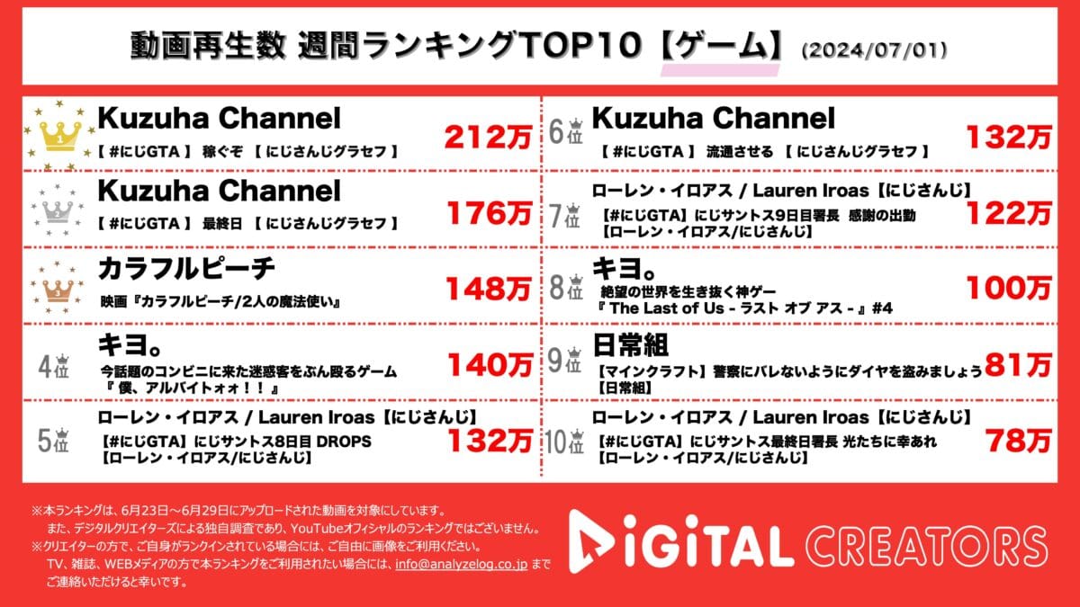 尚、対象は、企業公式チャンネルやニュース動画を除く、1分以上の動画。(切り抜きチャンネルを除く)※データ集計は7月1日で、広告による再生数も含まれる可能性があります。