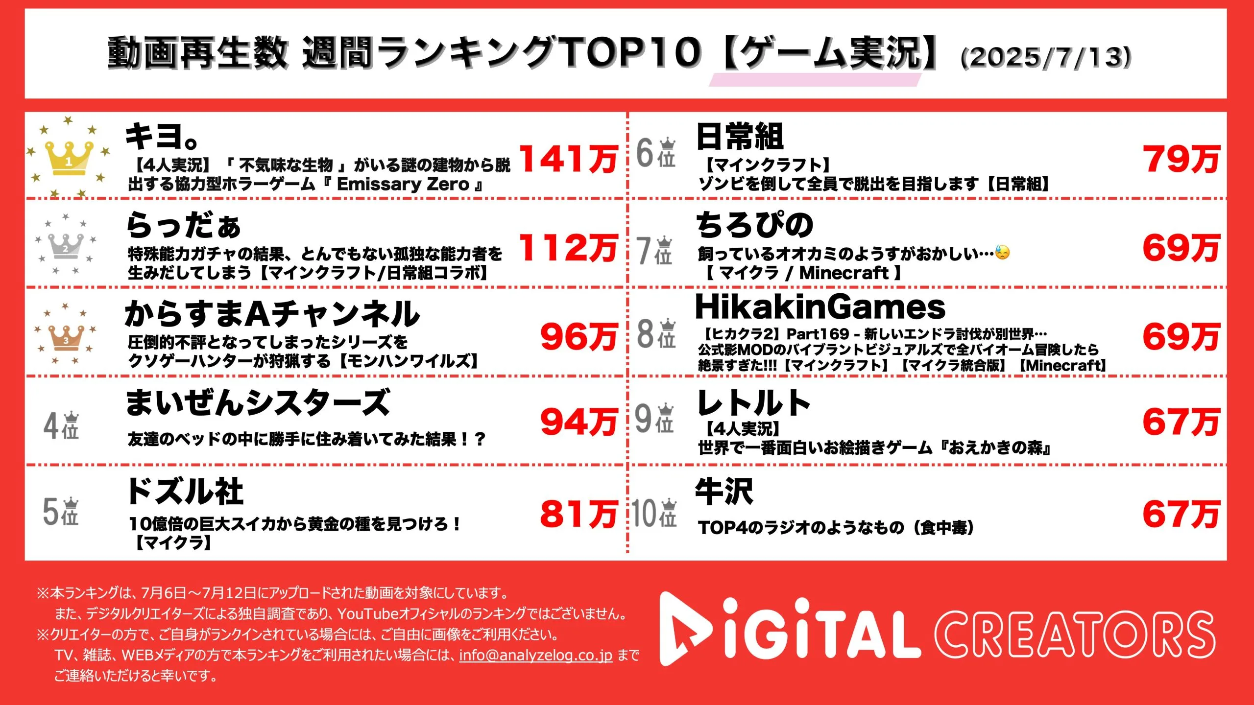 週間動画再生数ランキングゲーム部門を発表!『キヨ。』牛沢・レトルト・ガッチマンと謎解き脱出ホラーゲームをプレイ!『らっだぁ』日常組とコラボ!マインクラフトの特殊能力ガチャの結果は!?『からすまAチャンネル』賛否両論のモンスターハンターワイルズを自称クソゲーハンターがプレイ!
