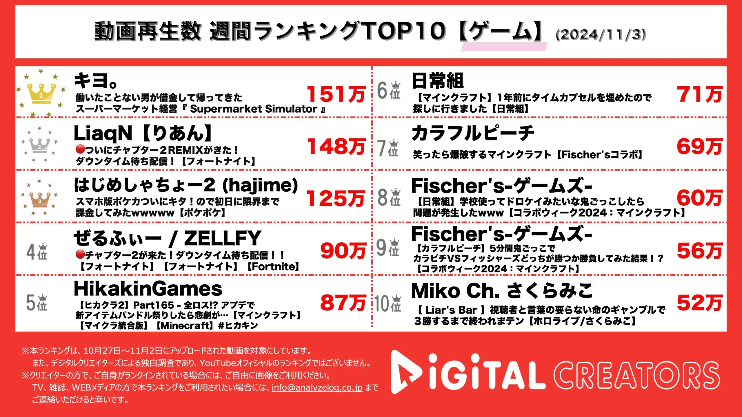今回は、10月27日〜11月2日に公開されたゲーム実況動画ランキングTOP10を発表。(11月3日集計)