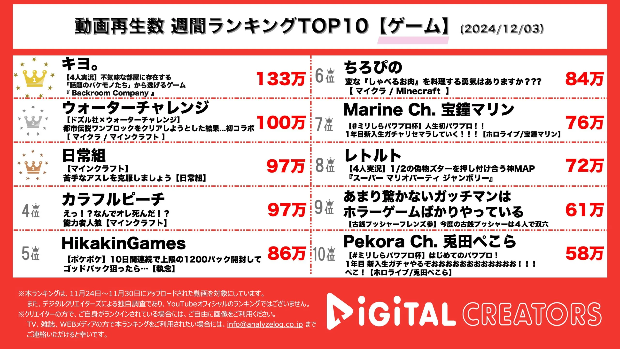 なお対象は、企業公式チャンネルやニュース動画を除く、1分以上の動画(切り抜きチャンネルを除く)。※データ集計は12月3日で、広告による再生数も含まれる可能性があります。1分以上3分以下でかつタイトルに#shortsと入っている動画につきましては、ショート動画扱いとさせていただきます。