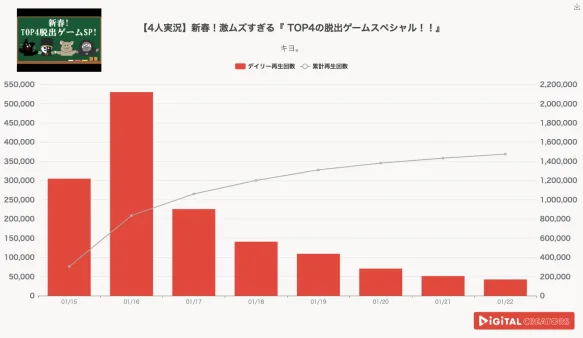 なお対象は、企業公式チャンネルやニュース動画を除く、1分以上の動画(切り抜きチャンネルを除く)。※データ集計は1月12日で、広告による再生数も含まれる可能性があります。1分以上3分以下でかつタイトルに#shortsと入っている動画につきましては、ショート動画扱いとさせていただきます。