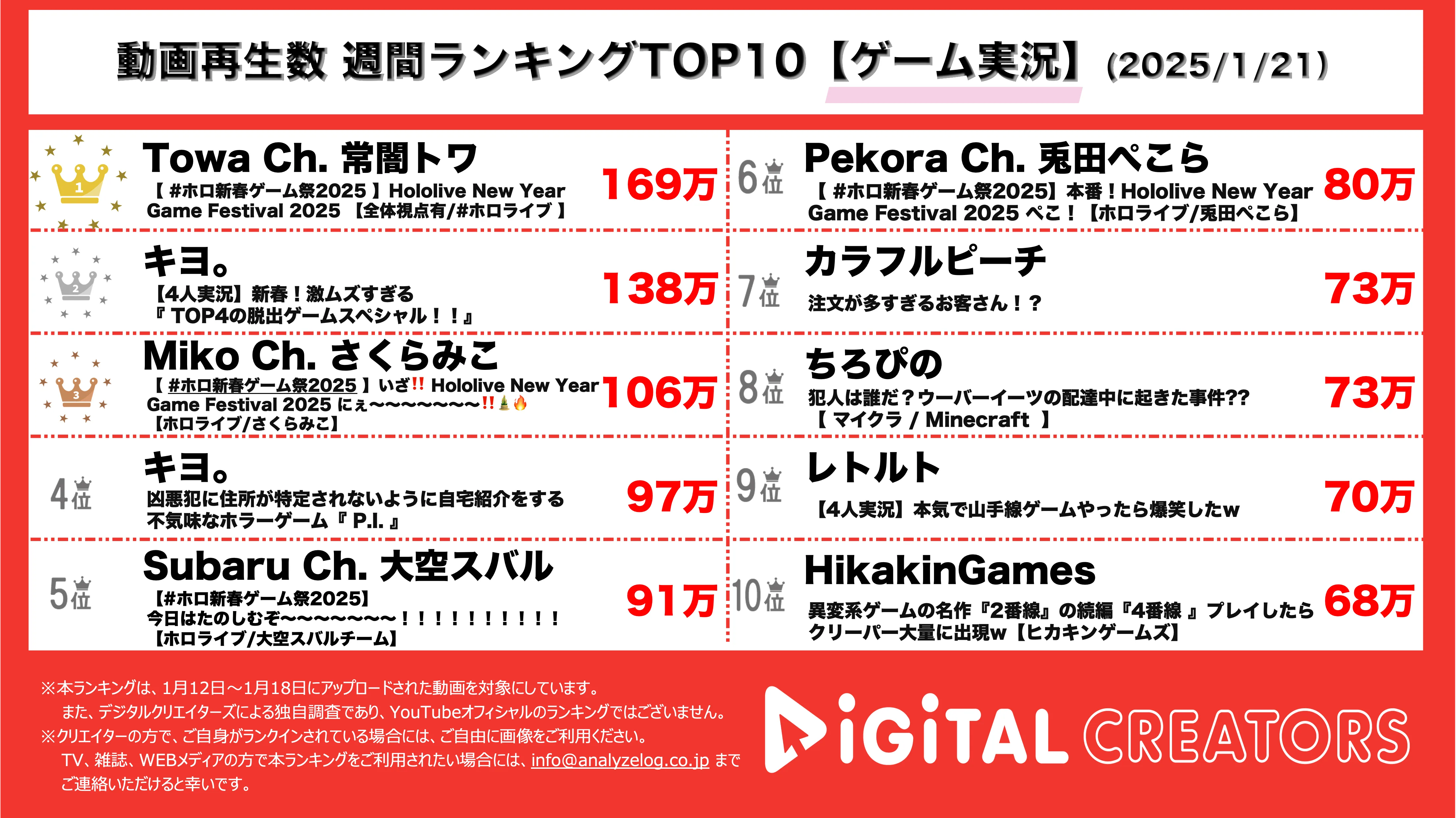 週間YouTube視聴回数 ゲーム実況ランキングを発表!ホロライブメンバー集合のゲーム祭り「ホロ新春ゲーム祭2025」の6時間弱にわたる配信が1位に!