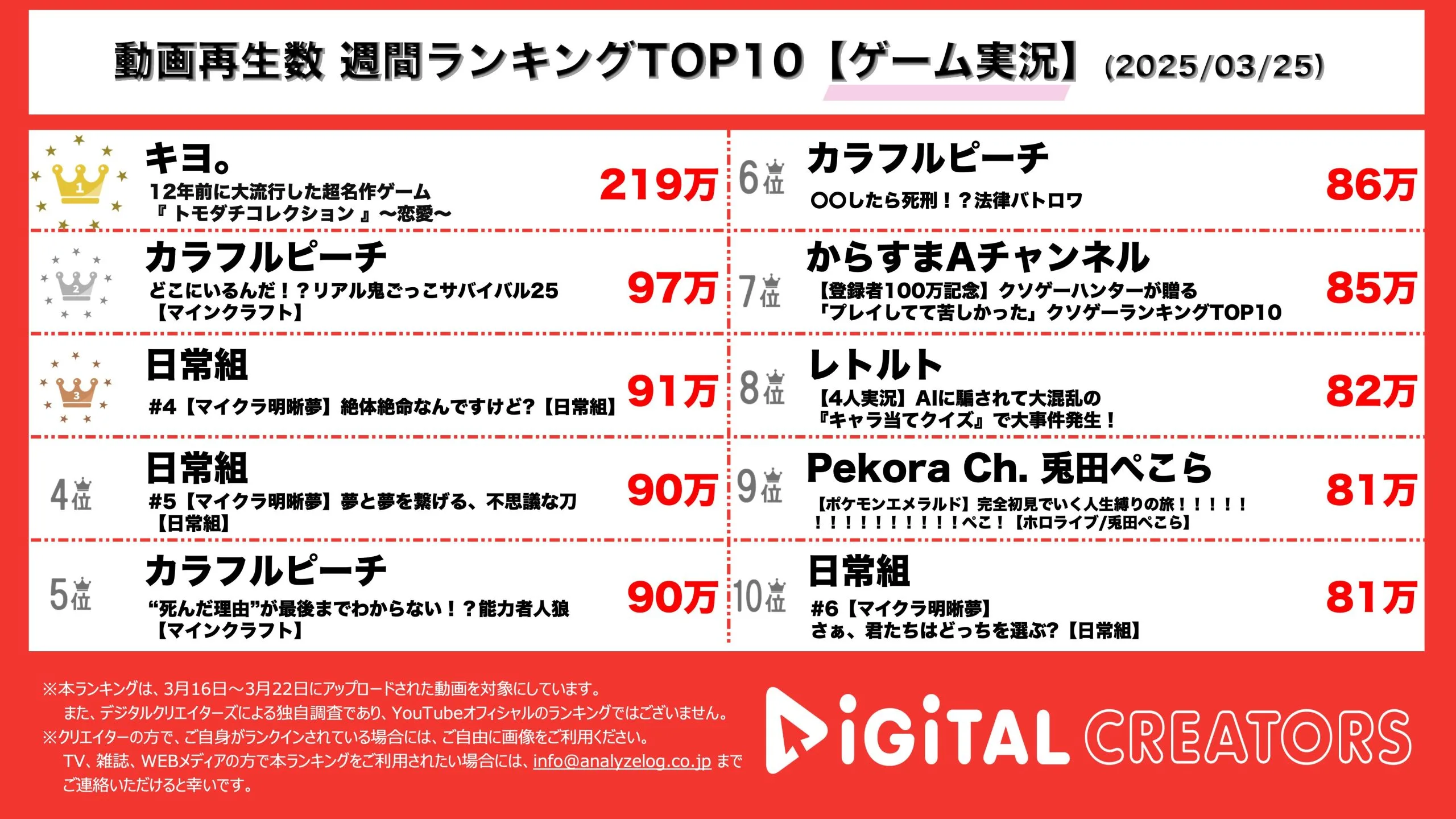 週間ゲーム実況YouTube再生回数ランキングを発表!キヨ。トモダチコレクション恋愛編公開!無事カップル誕生なるか…?カラフルピーチ、マイクラ鬼ごっこ!日常組、仲間締め出しハプニング?