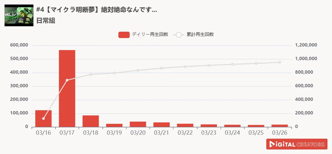 3位を獲得したのは『日常組』。今回はマインクラフトの中で自由に世界を操るような体験を楽しむ「マイクラ明晰夢」の様子を公開した。また、同チャンネル4位、10位にもランクインしている。