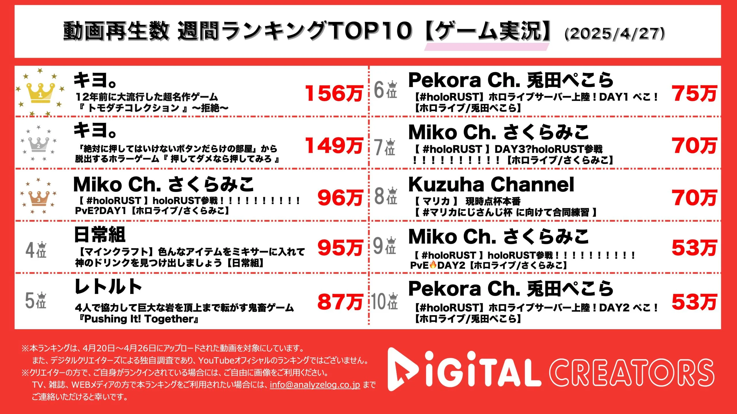 週間ゲーム実況YouTube再生回数ランキングを発表!キヨ。、トモコレ拒絶編公開!押してダメならおしてみろ、新感覚ホラーゲーム公開!さくらみこ、毎年恒例「holoRUST」配信!