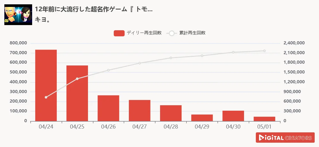 12年前に大流行した「トモダチコレクション」の拒絶編が公開された。「トモダチコレクション」は来年ニンテンドーSwichで新作が発売されることが発表されており、人気が高まっている。さらに、キヨが動画で実況している「トモダチコレクション」はすべて再生回数200万回を突破しており、大人気シリーズとなっている。