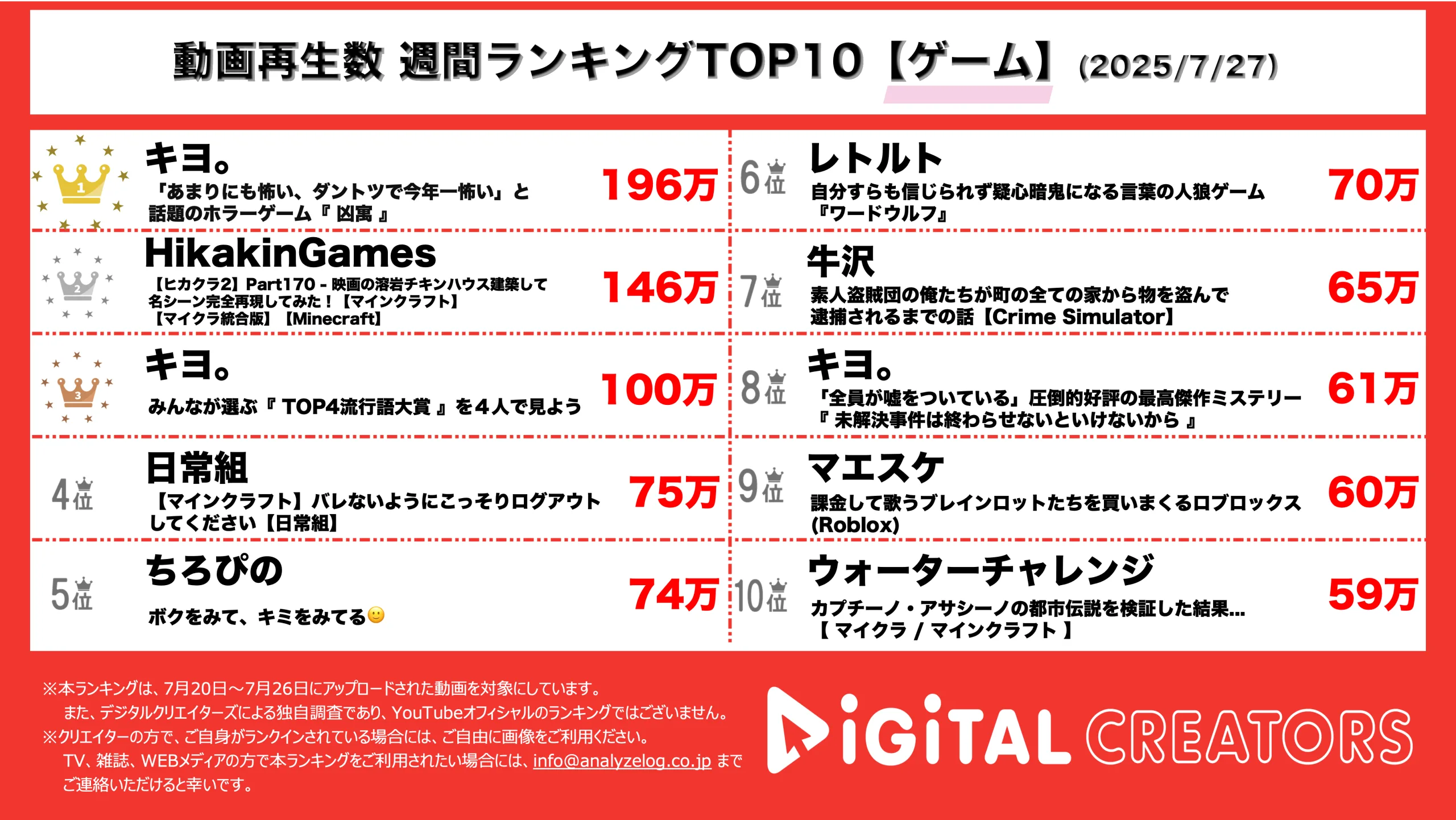 今回は7月20日〜7月26日の間にYouTube上で公開された動画の再生数ランキングゲーム部門を発表!(7月27日集計)