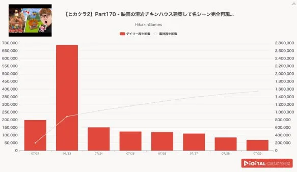 大人気実況シリーズ「ヒカクラ2」のPart170が2位にランクインした。今回の企画は、映画「マインクラフト/ザ・ムービー」で使用された“溶岩チキンの歌”のレコードが追加されたということで、そのレコードをゲットして映画のシーンを再現しようというものである。“溶岩チキン”とは、映画内で使われた調理法で、溶岩をチキンに流す大胆な方法のことであるという。