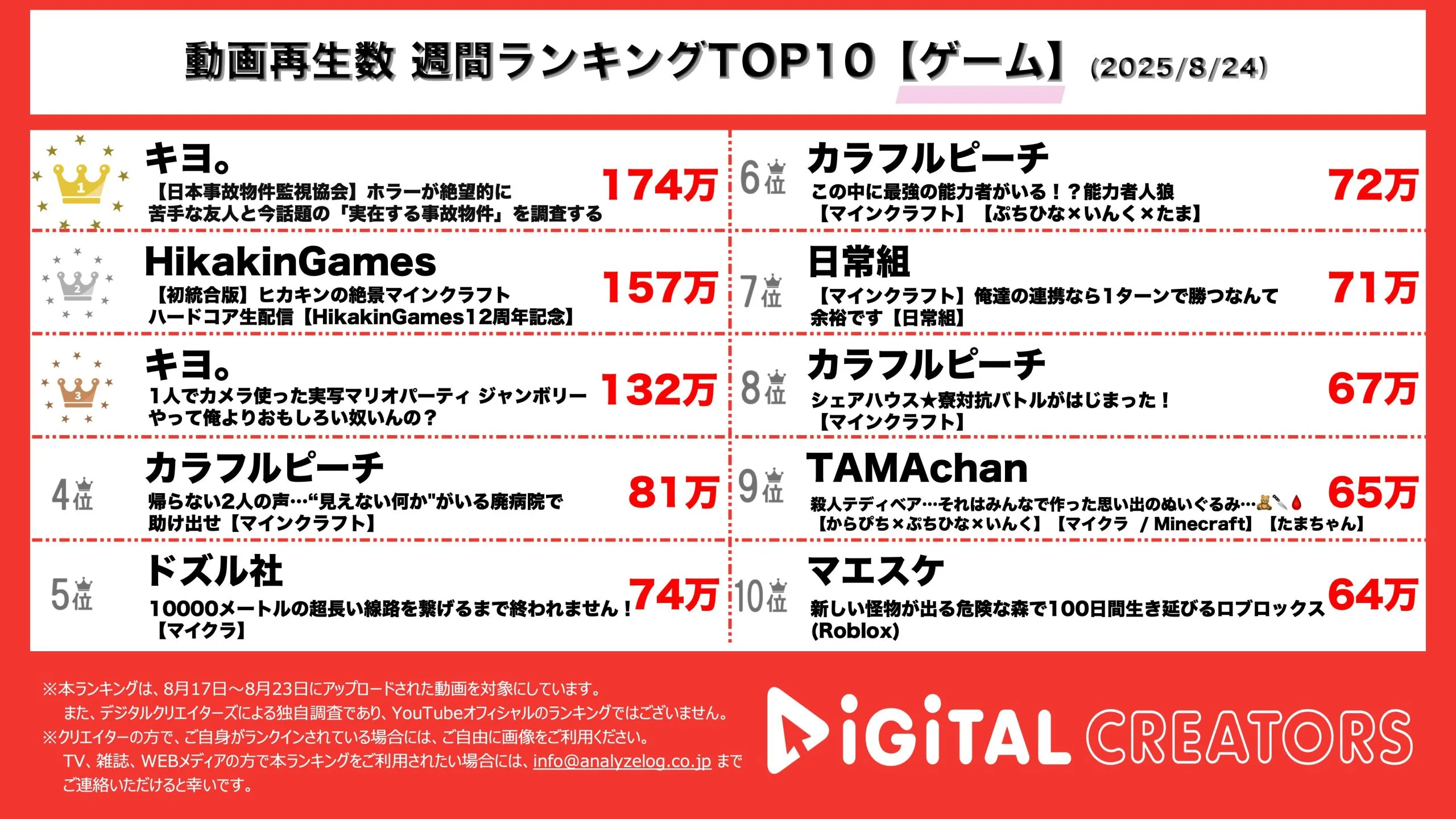 今回は、8月17日〜8月23日の間にYouTubeで公開された動画の再生数ランキングゲーム部門TOP10を発表!