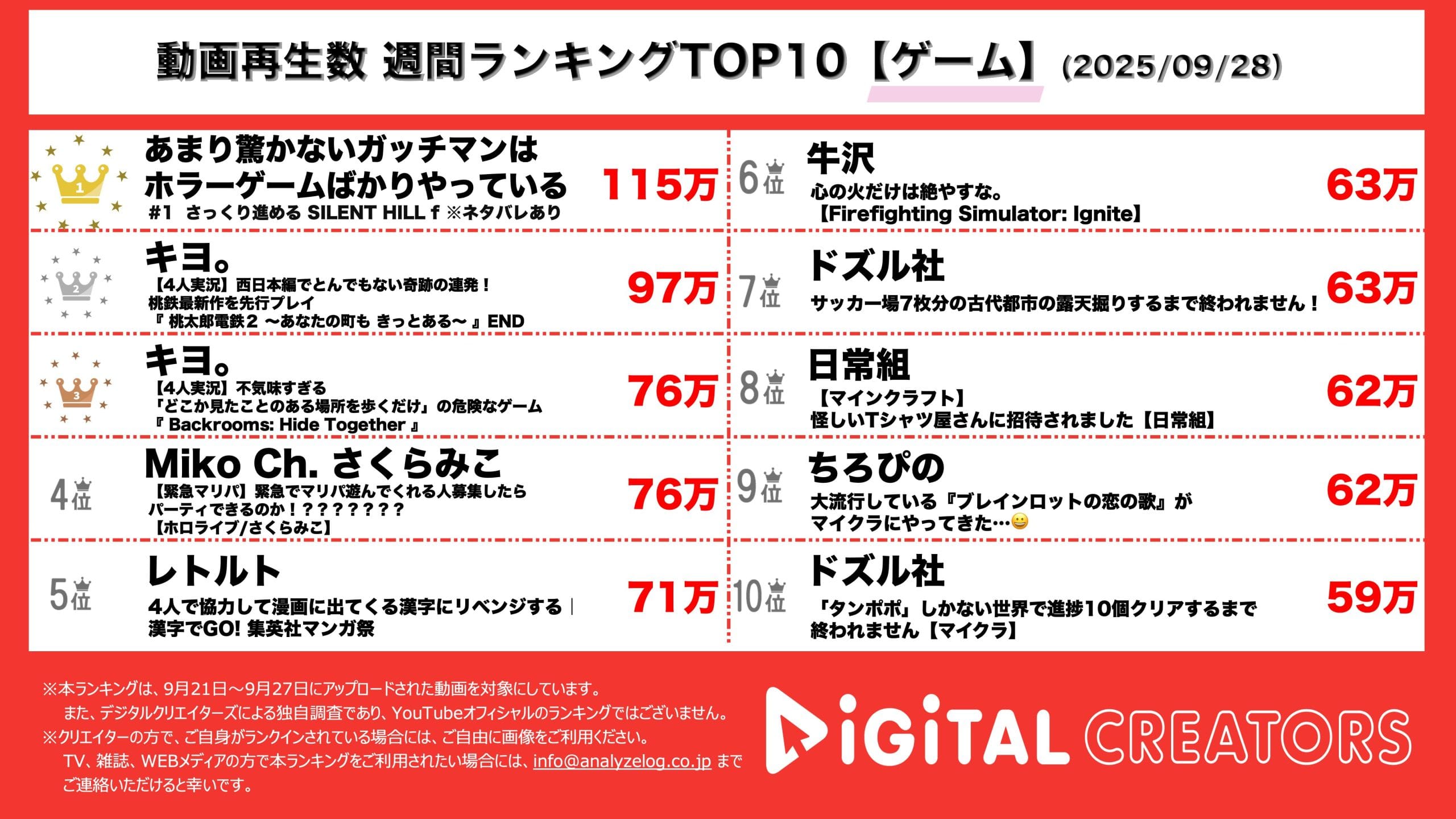 1位を獲得したのは『あまり驚かないガッチマンはホラーゲームばかりやっている』。9月25日に発売されたホラーゲーム「SILENT HILL」シリーズ最新作「SILENT HILL f」の実況動画を先行で公開した。さらに、今週は『ガッチマン』のYouTubeチャンネル登録者数が200万人を突破しており、人気をさらに広げている。