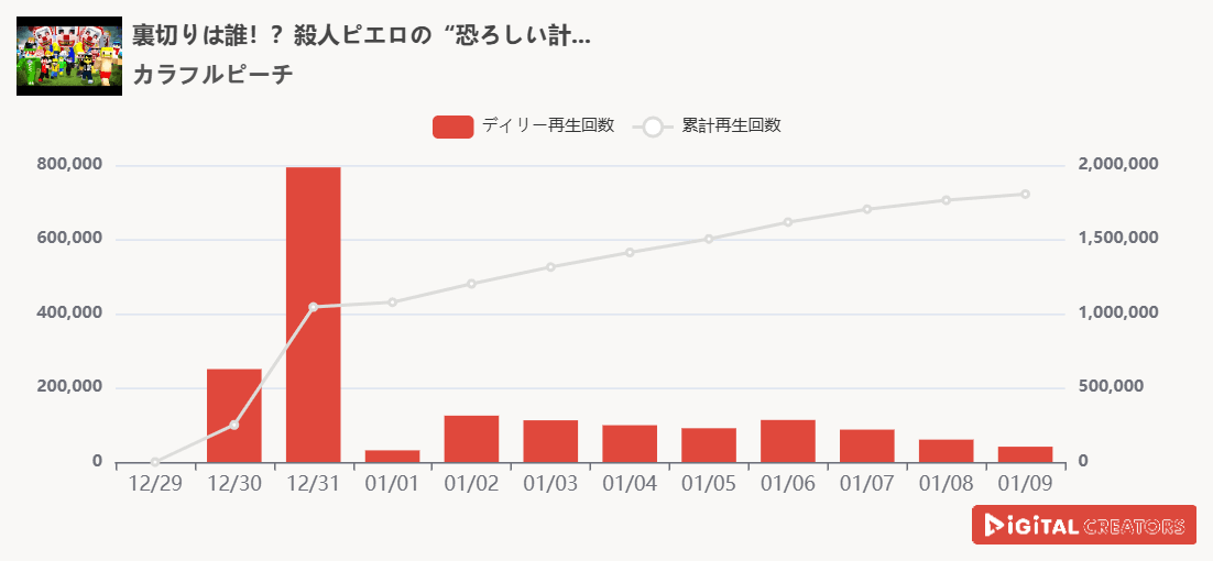 1位を獲得したのは『カラフルピーチ』。年末にかけて行われたゲーム実況系グループYouTuber『カラフルピーチ』と『ドズル社』のマインクラフト1週間コラボ。最終日に公開されたのはカラフルピーチの人気企画「ピエロがいるサバイバル」。