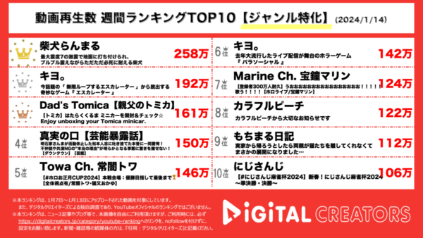 今回は、1月7日~1月13日にジャンル特化YouTubeチャンネルで公開された動画ランキング(マルチYouTuber)TOP10を発表。(1月14日集計)。