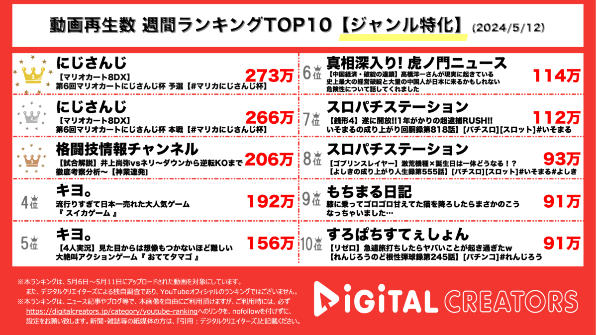 今回は、5月5日〜5月11日にYouTubeで公開されたジャンル特化動画再生数ランキングを発表。(5月12日集計)