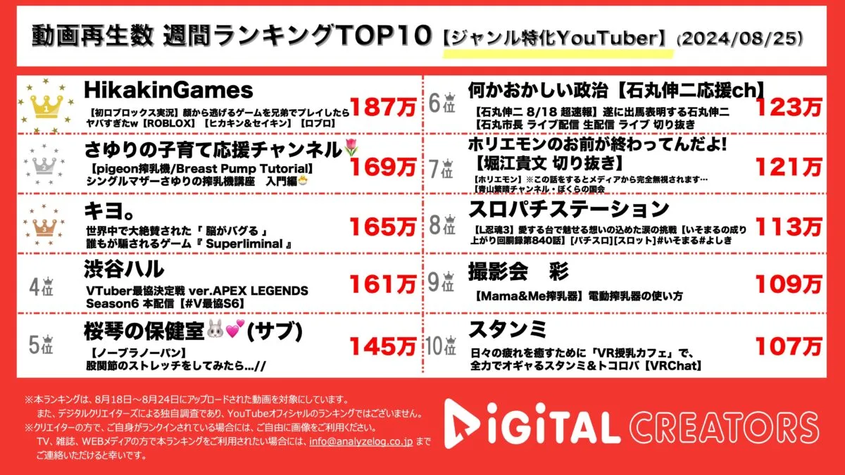 尚、対象は、企業公式チャンネルやニュース動画を除く、1分以上の動画。(切り抜きチャンネルを除く)※データ集計は8月25日で、広告による再生数も含まれる可能性があります。