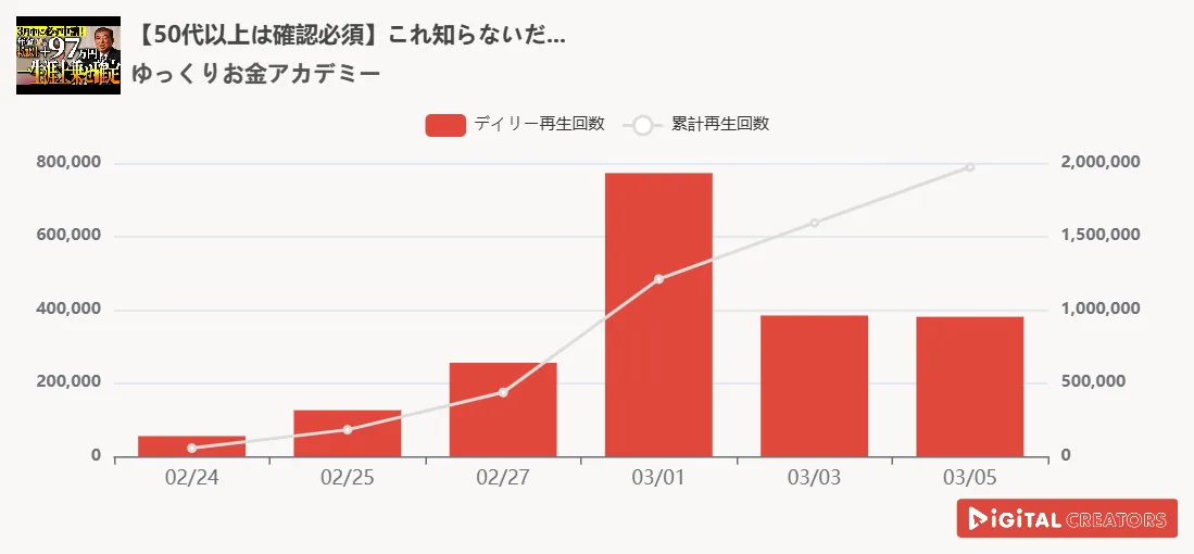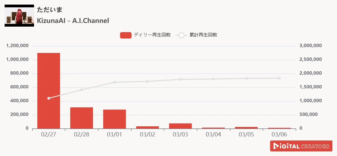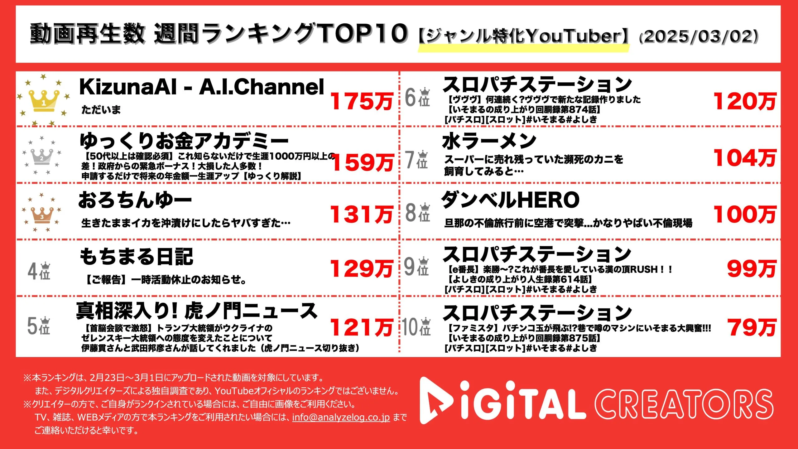 尚、対象は、企業公式チャンネルやニュース動画を除く、1分以上の動画。(切り抜きチャンネルを除く)※データ集計は3月2日で、広告による再生数含まれる可能性があります。
