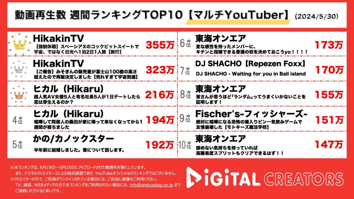 今回は、5月19日~5月25日にYouTubeで公開された、マルチYouTuber動画ランキングTOP10を発表(5月30日集計)。