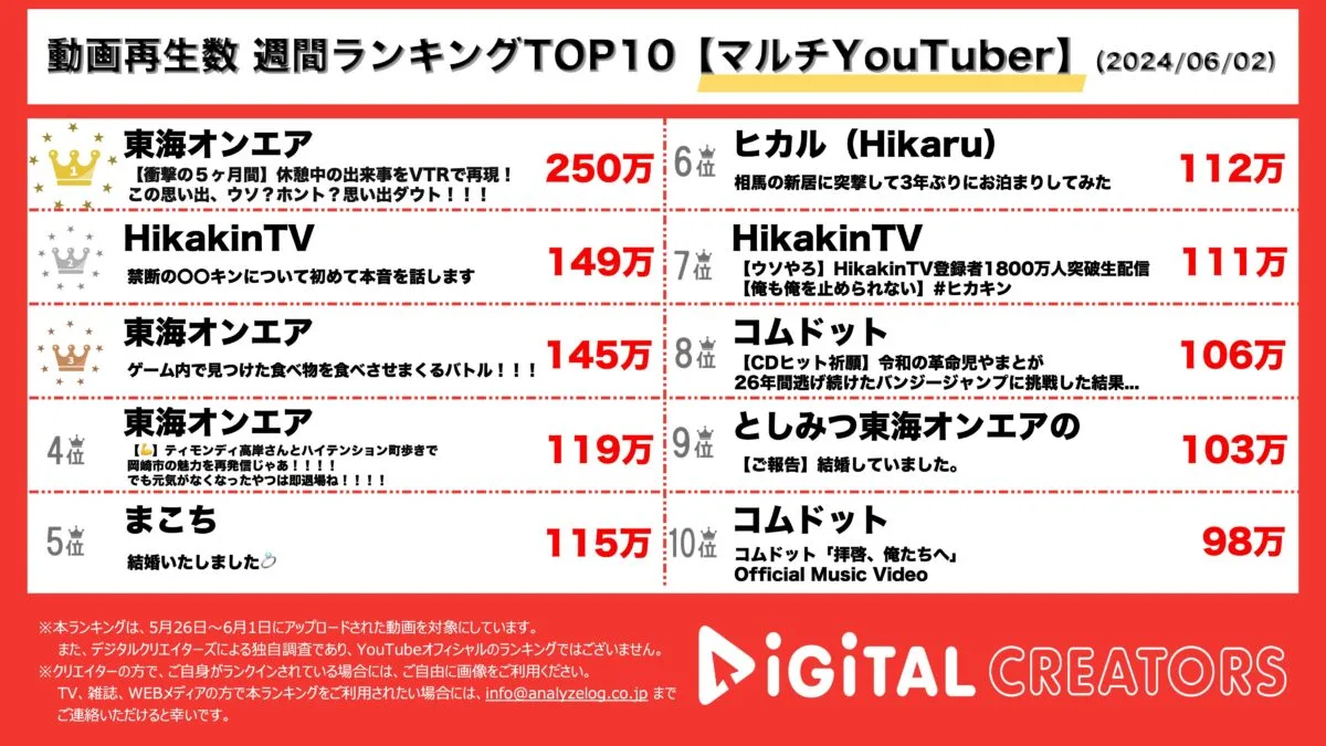 今回は、5月26日〜6月1日にYouTube上で公開された動画の再生数ランキング(マルチYouTuber)を発表。(6月2日集計)