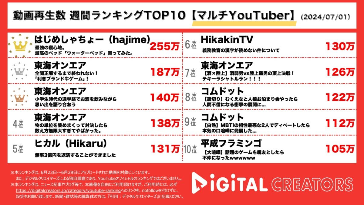 今回は、6月23日~29日にYouTubeで公開された、マルチYouTuber動画ランキングTOP10を発表(7月1日集計)。