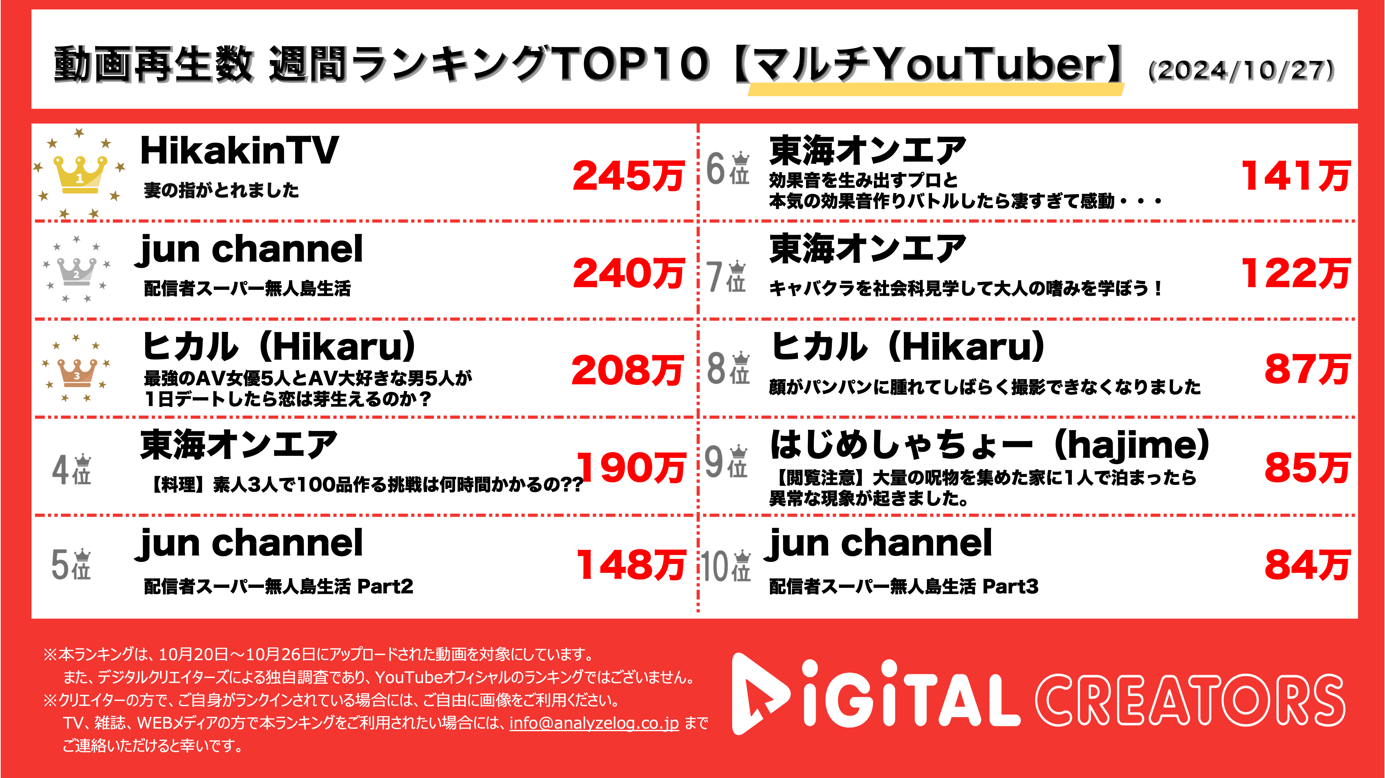 指が取れた…!?ヒカキン、妻のけがを報告!加藤純一、無人島企画始動!レジェンドAV女優参戦ヒカル5人と5対5デート企画も!【週間マルチYouTuberランキング】