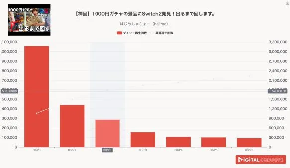 2位を獲得したのは『はじめしゃちょー(hajime)』。1000円ガチャをNintendo Switch2が出るまで回し続ける動画を公開した。
