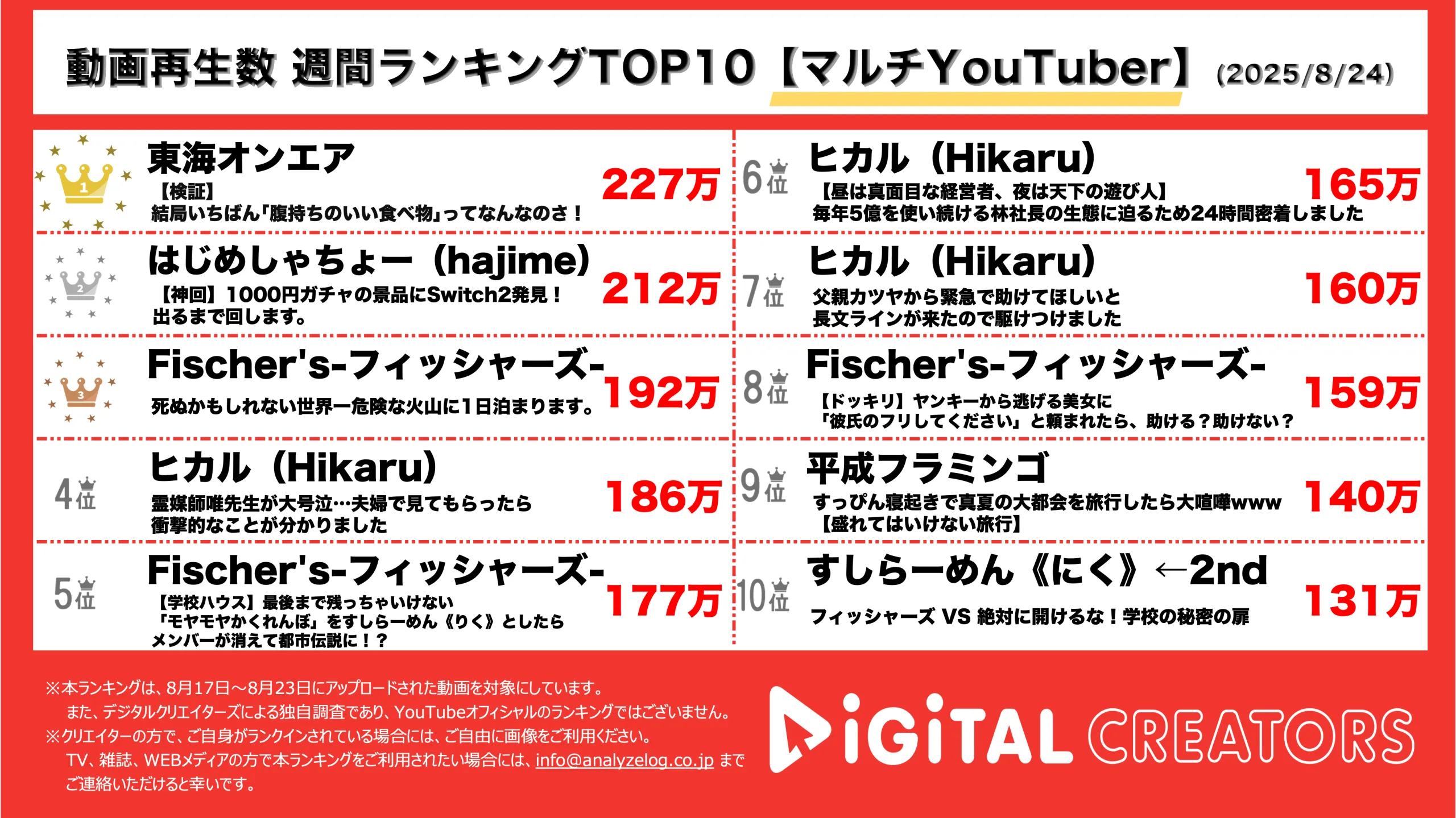 週間再生数ランキングマルチYouTuber部門を発表!東海オンエア、一番腹持ちのいい食べ物は?はじめしゃちょーがスイッチ2をゲットするまで1000円ガチャを回し続ける!フィッシャーズ、超絶過酷な旅の先で見た絶景とは…