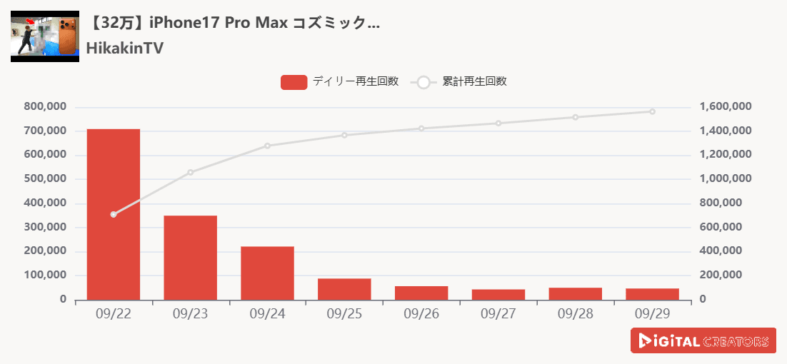 3位を獲得したのは『HikakinTV』。9月19日に販売開始されたiPhoneの新シリーズのiPhone17 Pro Maxの開封動画を公開した。他にも、iPhone AirやAirPods Pro 3も開封した。さらに、動画の最後にははじめしゃちょーも登場し、結婚祝いのサプライズの様子も公開した。