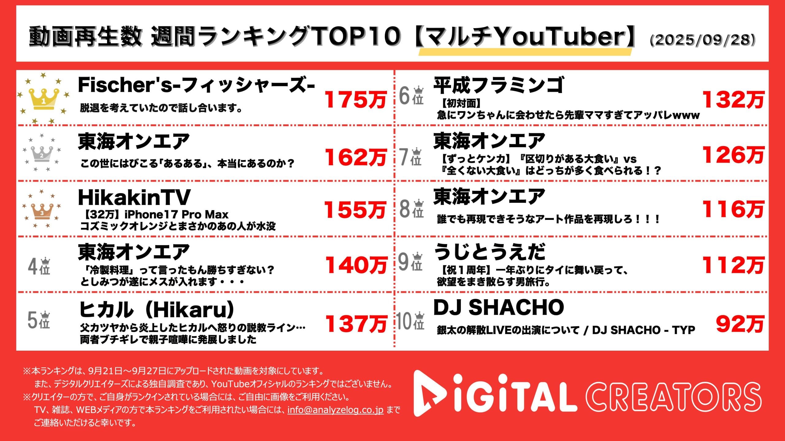 週間マルチYouTuber動画再生回数ランキングを発表!フィッシャーズ、メンバーが脱退!?チャンネル史上最高記録を突破!進撃のノア、オープンマリッジについて本音を語る!東海オンエア、飲み会あるある、本当にあるの⁇ヒカキン、iPhone17 Pro Max開封‼はじめしゃちょーへの結婚祝いサプライズも‼