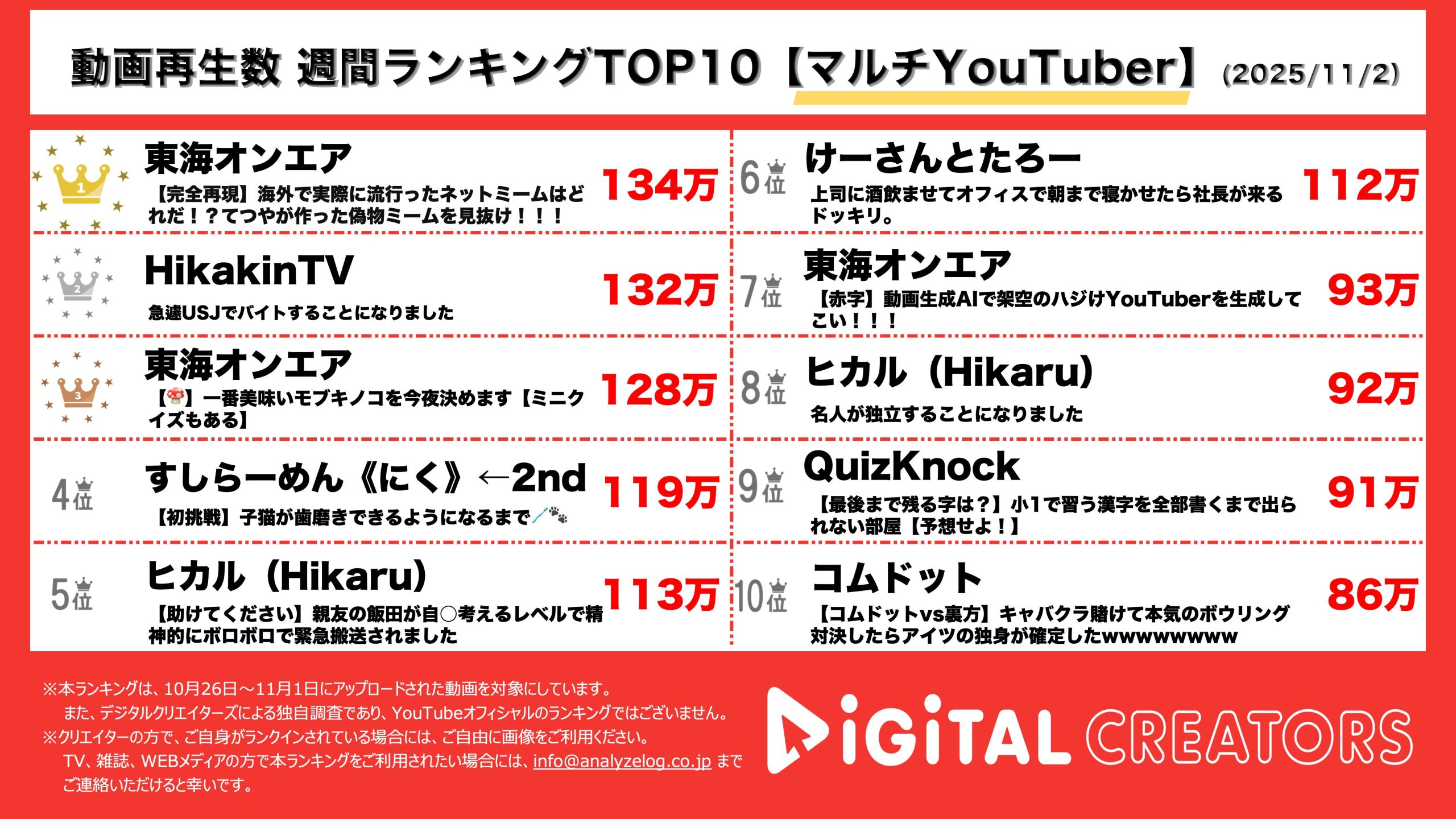 今回は10月26日~11月1日にYouTubeで公開された動画ランキングマルチYoutuber部門TOP10を発表。(11月2日集計)