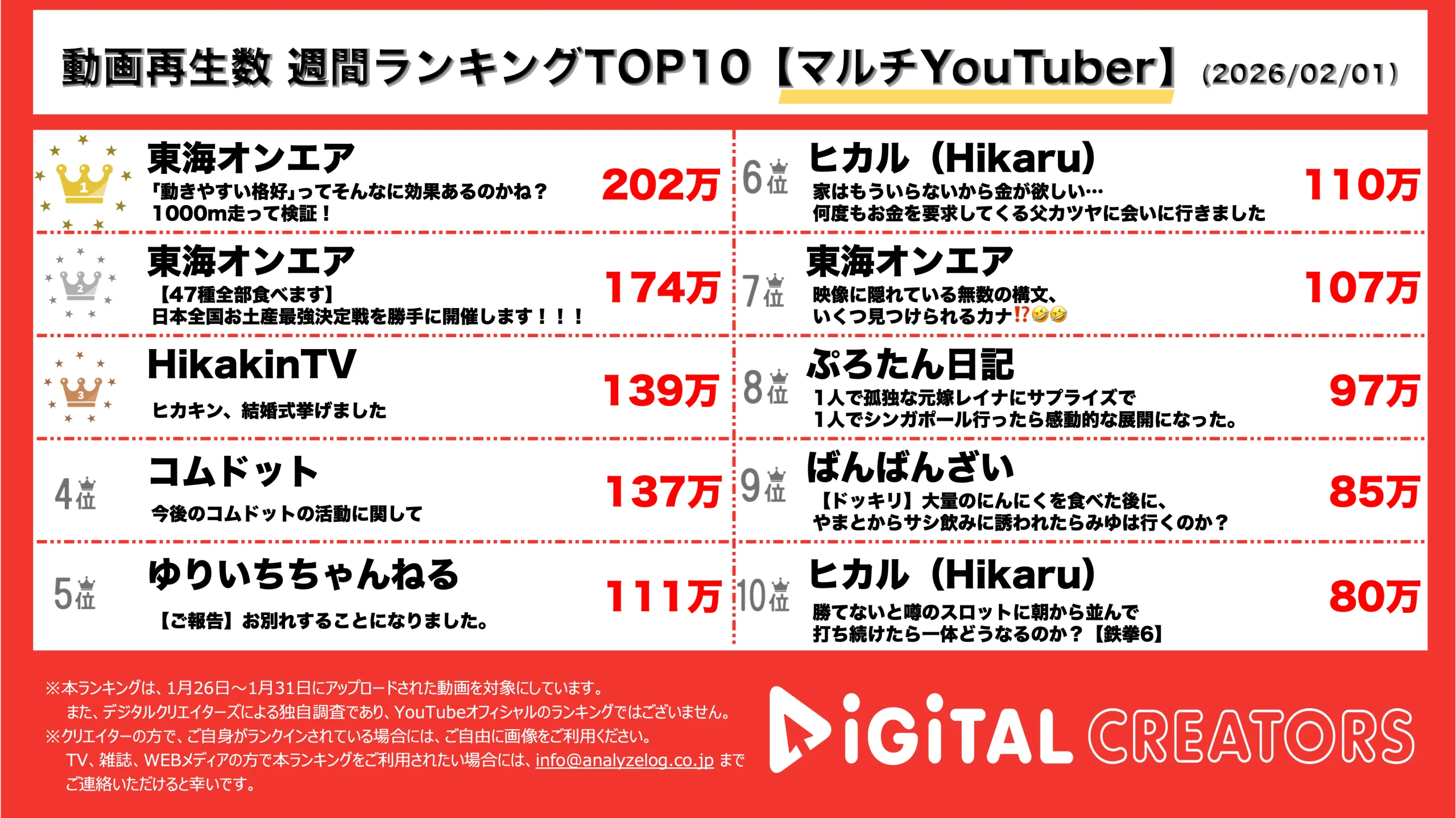 今回は1月25日~1月31日にYouTubeで公開された動画ランキングの総合TOP10を発表。(2月1日集計)