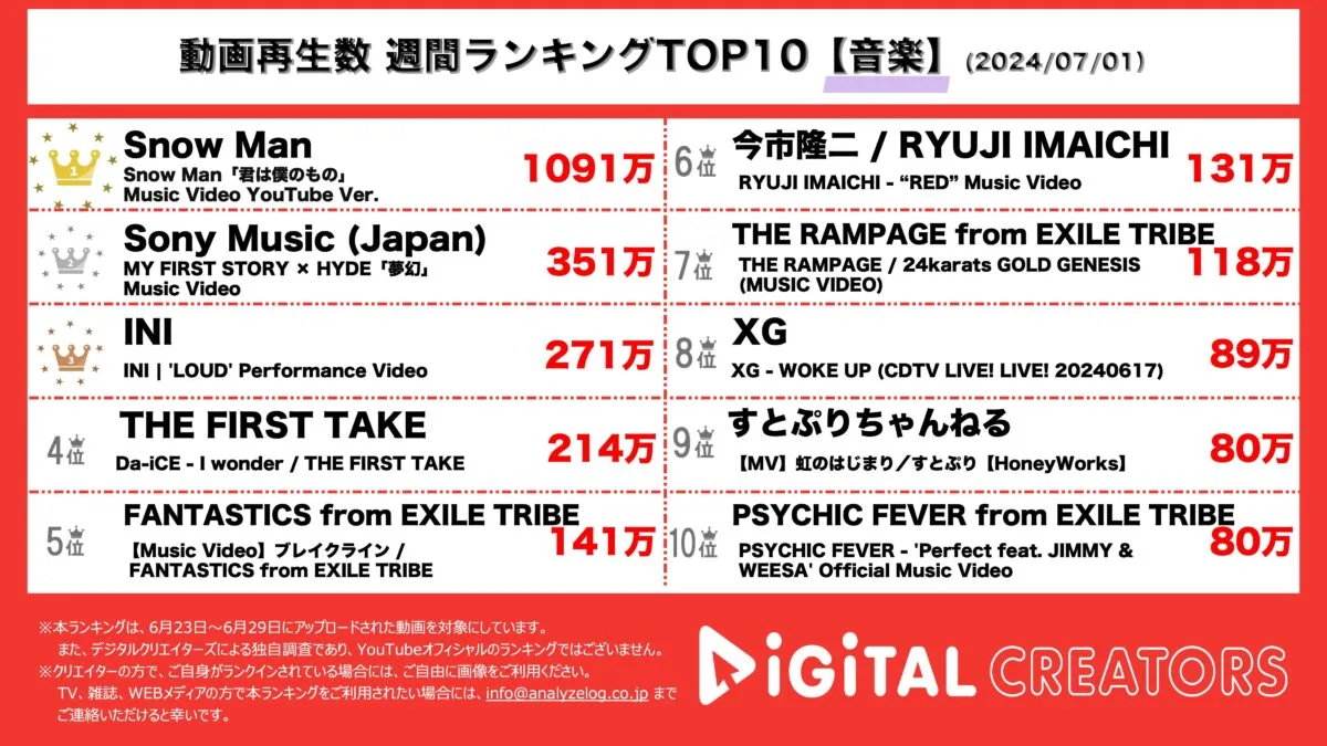 今回は、6月23日から6月29日にYouTubeで公開された動画の音楽ランキングを発表(7月1日集計)。