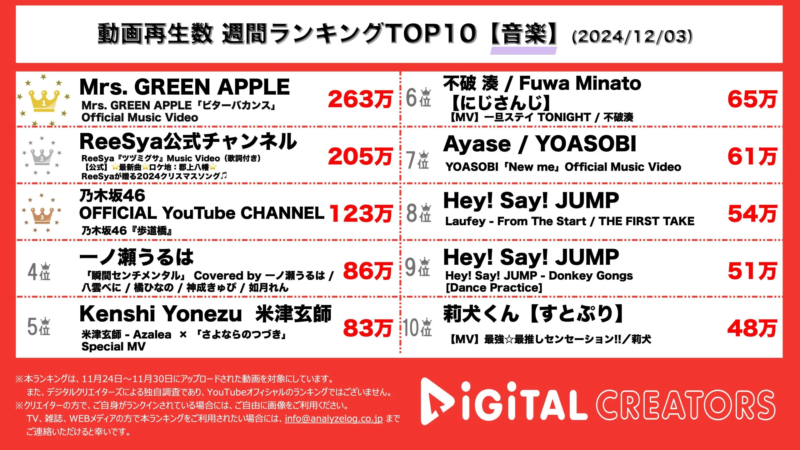 1位を獲得したのは『Mrs. GREEN APPLE』。2024年11月29日リリースの新曲「ビターバカンス」のMVが公開された。この楽曲は映画『聖☆おにいさん THE MOVIE~ホーリーメンVS悪魔軍団~』主題歌としても注目を集めている。