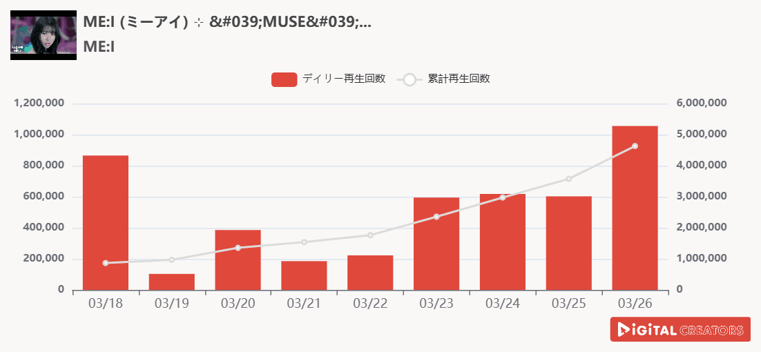 4月16日に発売されるME:Iの3rdシングル「MUSE」のMVが公開された。メンバー1人ひとりが憧れのアーティストの世界へ、ファンからの応援とともに羽ばたいたME:Iにぴったりの楽曲となっている。
