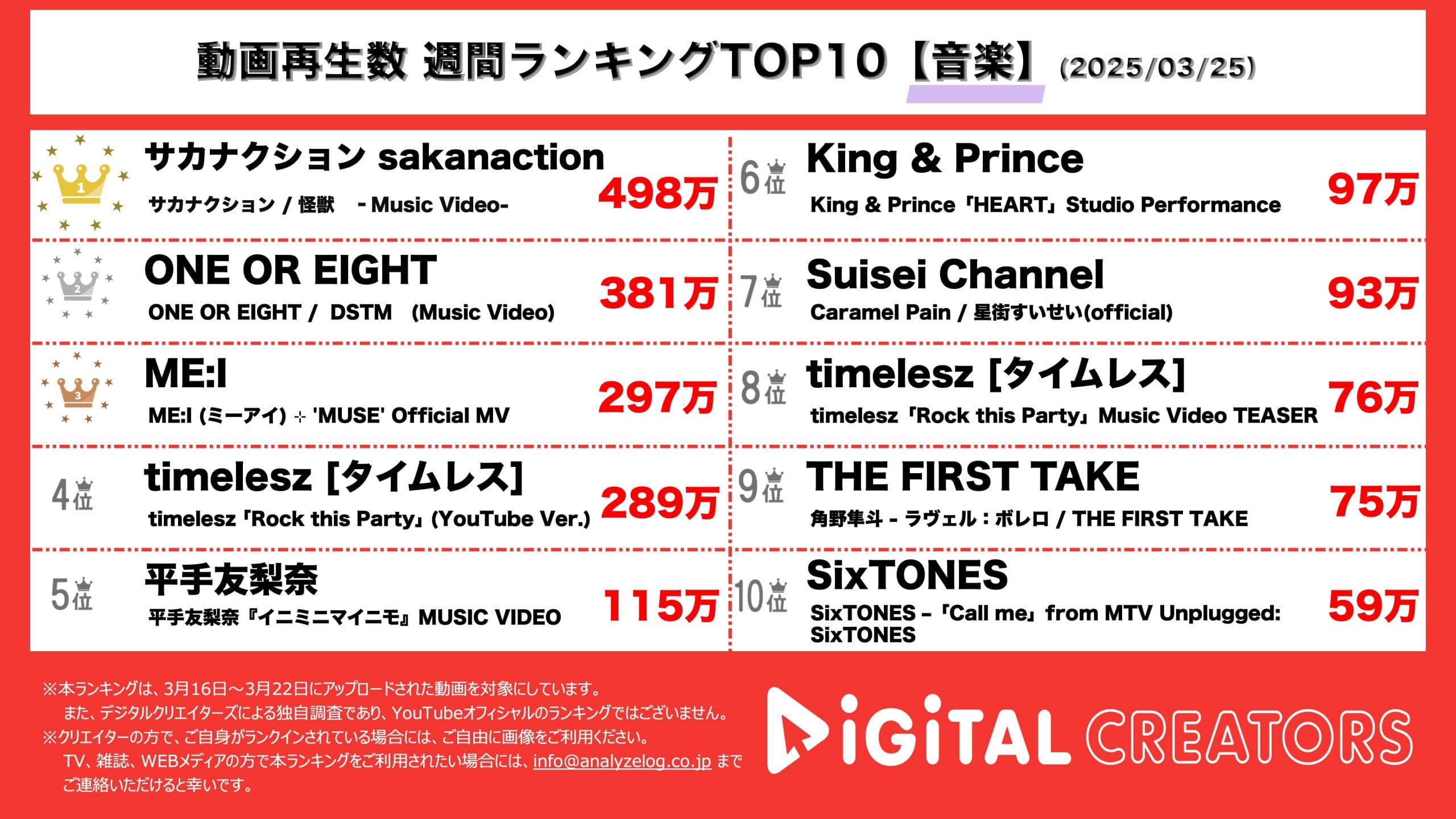 今回は3月16日~3月22日にYouTubeで公開された動画ランキングの総合TOP10を発表。(3月25日集計)