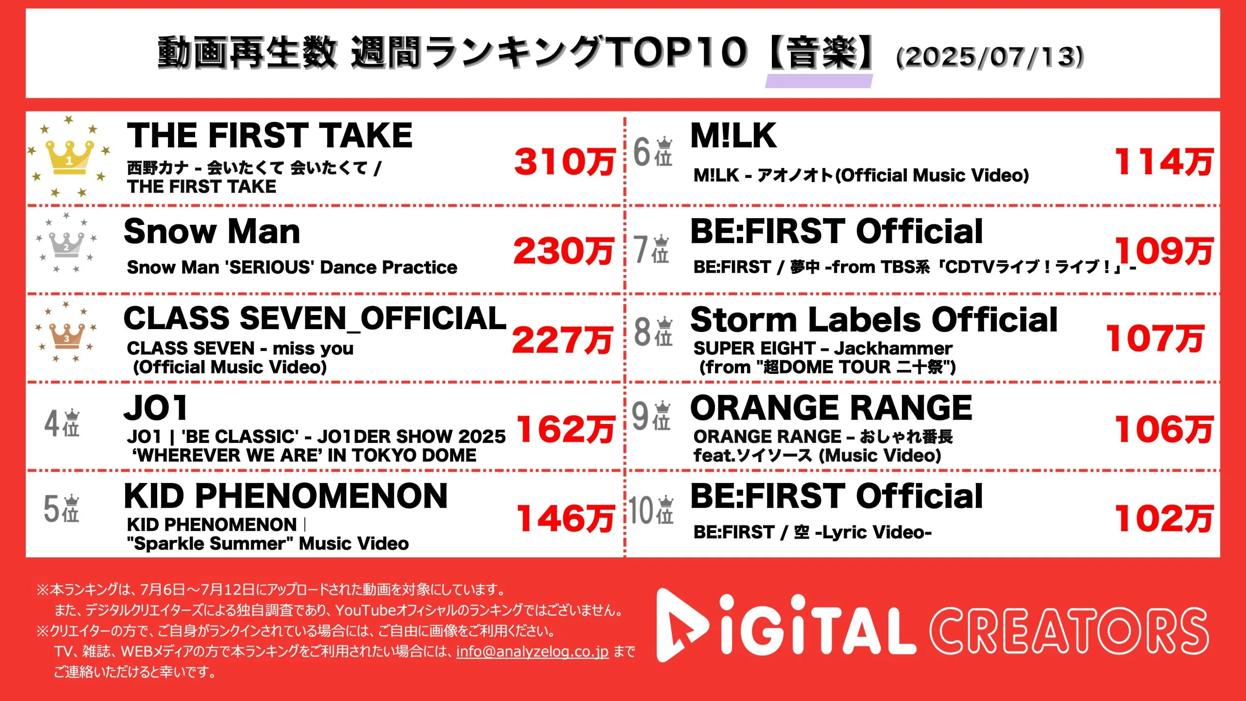 今回は7月6日~7月12日にYouTubeで公開された動画ランキングの音楽TOP10を発表。(7月13日集計)