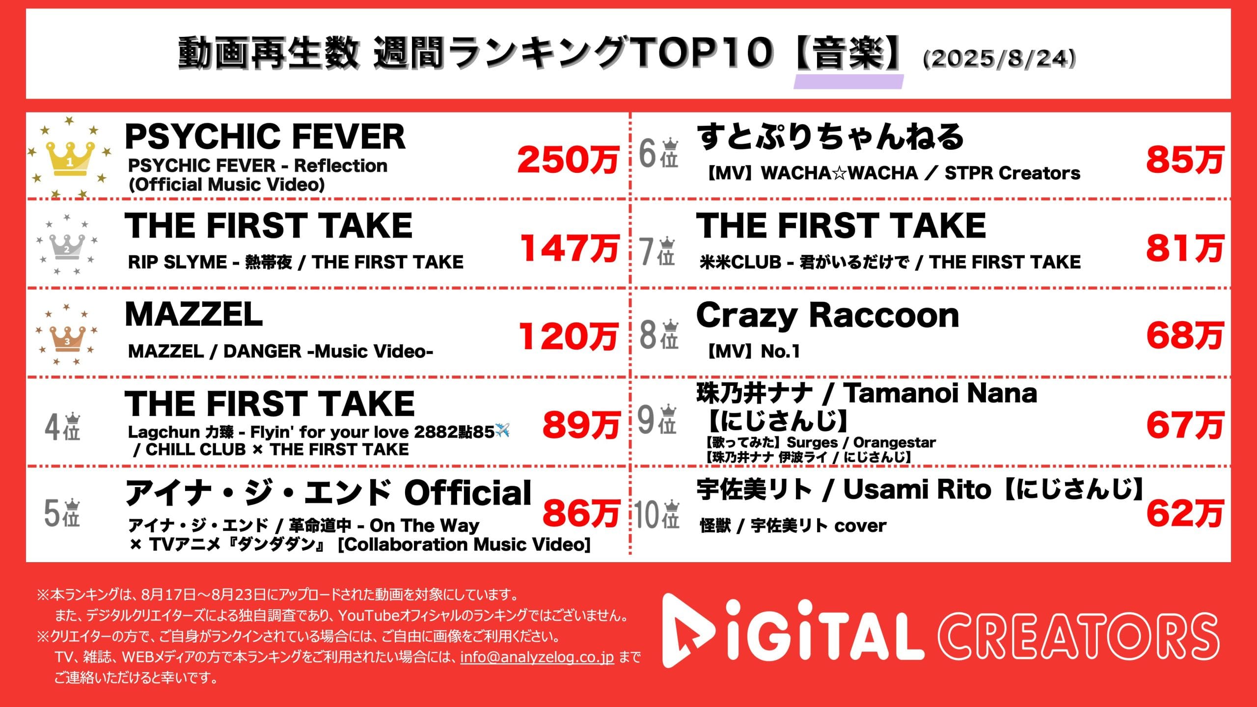 今回は、8月17日〜8月23日にYouTube上で公開された動画の再生数ランキング音楽部門TOP10を発表!(8月24日集計)