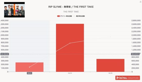 2位を獲得したのは『THE FIRST TAKE』だ。RIP SLYMEが初登場し、代表曲である「熱帯夜」を一発撮りでパフォーマンスした。