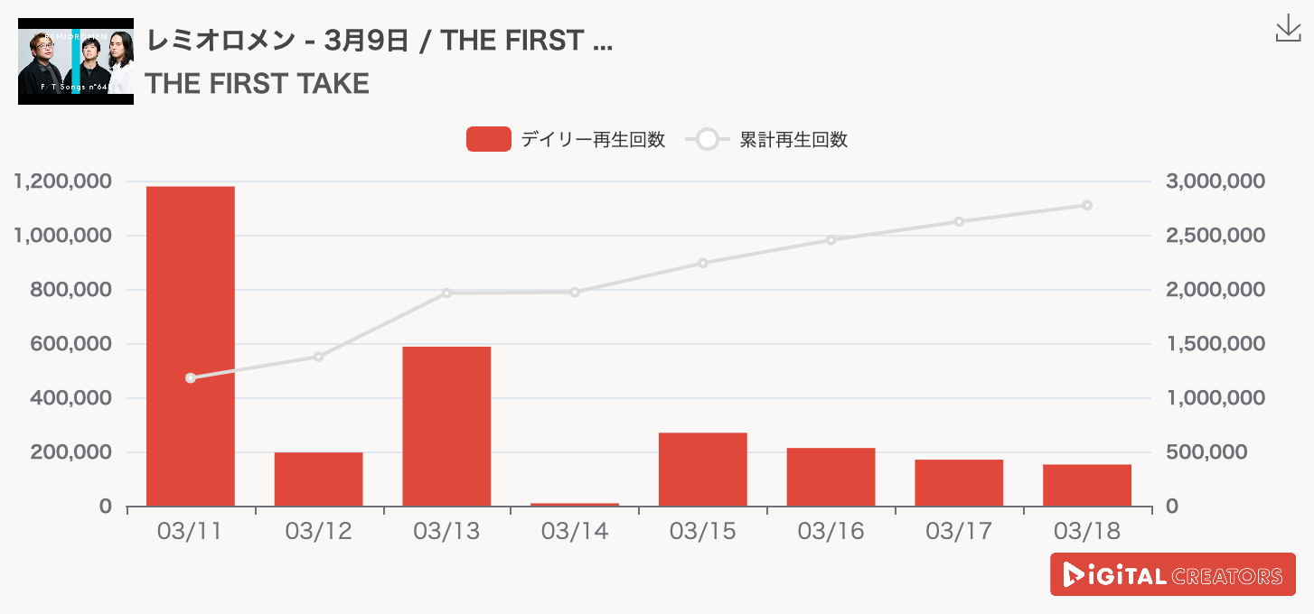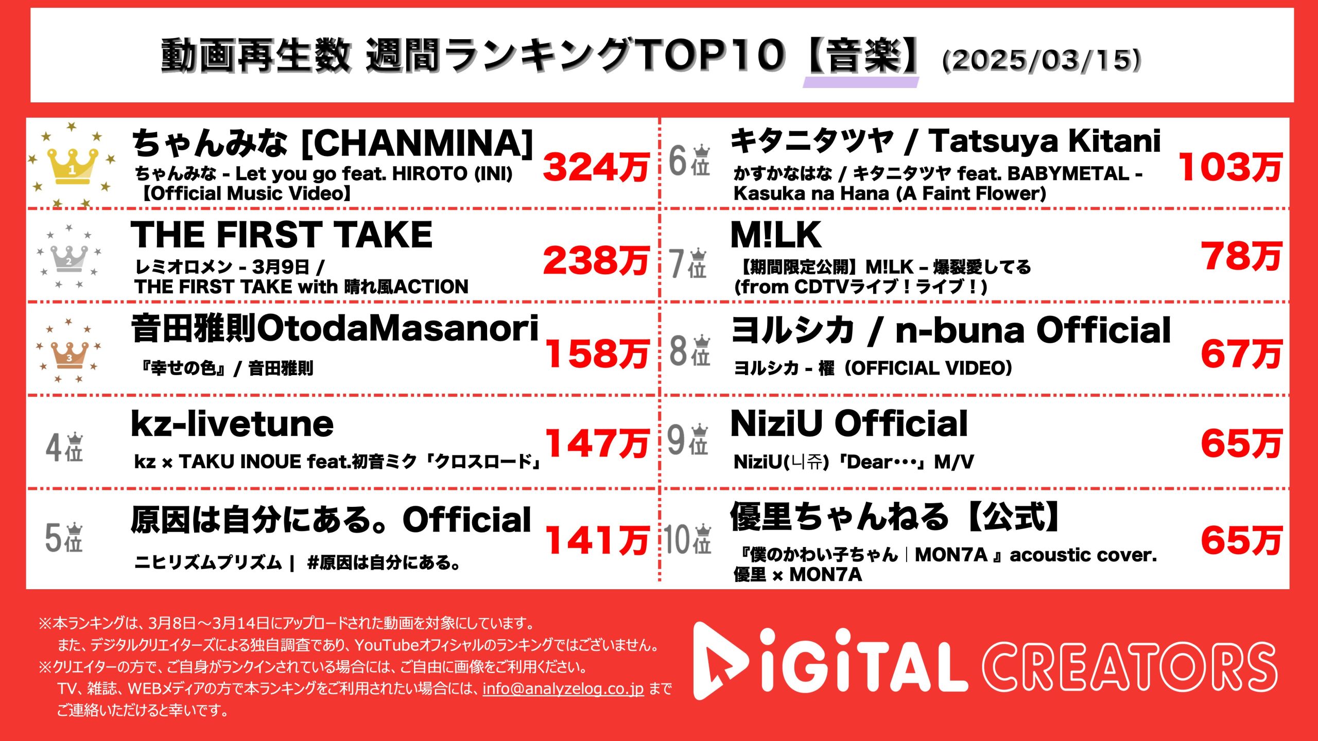 週間YouTube音楽動画再生回数ランキングを発表!ちゃんみな、10周年記念でINI・HIROTOと胸熱コラボ!THE FIRST TAKE、レミオロメンが14年振りに活動再開し「3月9日」を披露。音田雅紀、赤楚衛二主演ドラマのエンディングテーマ曲に大抜擢!