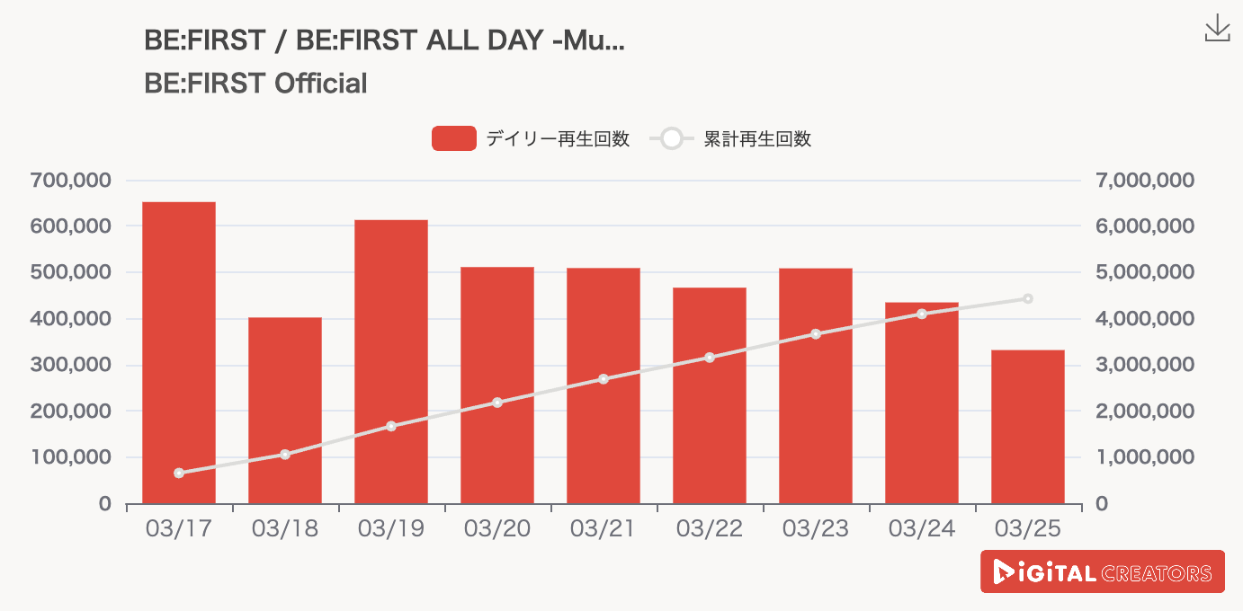 3月16日にデジタルリリースされた新曲「BE:FIRST ALL DAY」のMVを公開。本楽曲は「Billboard JAPAN総合ソング・チャート JAPAN Hot 100」(3月25日公開)にて自身通算12作目となる1位を獲得している。