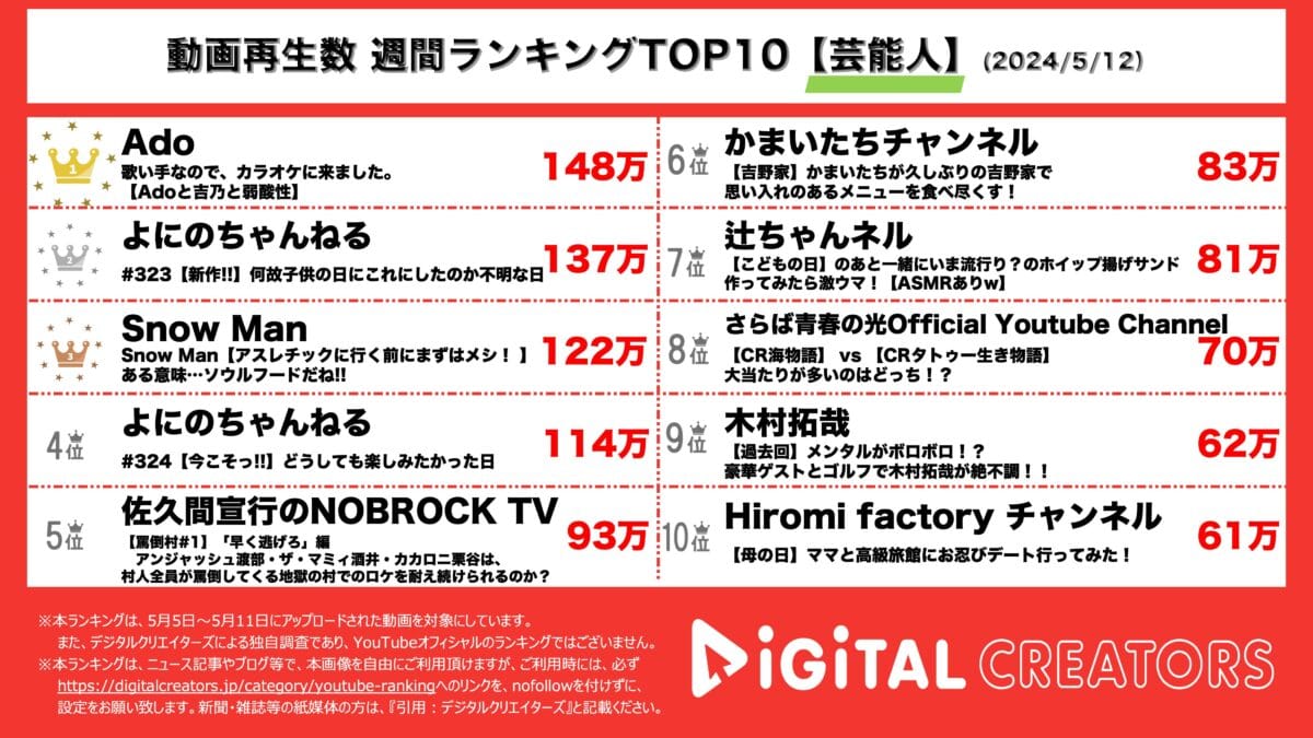 今回は、5月5日〜5月11日にYouTubeで公開された芸能人の動画再生数ランキングを発表。(5月12日集計)