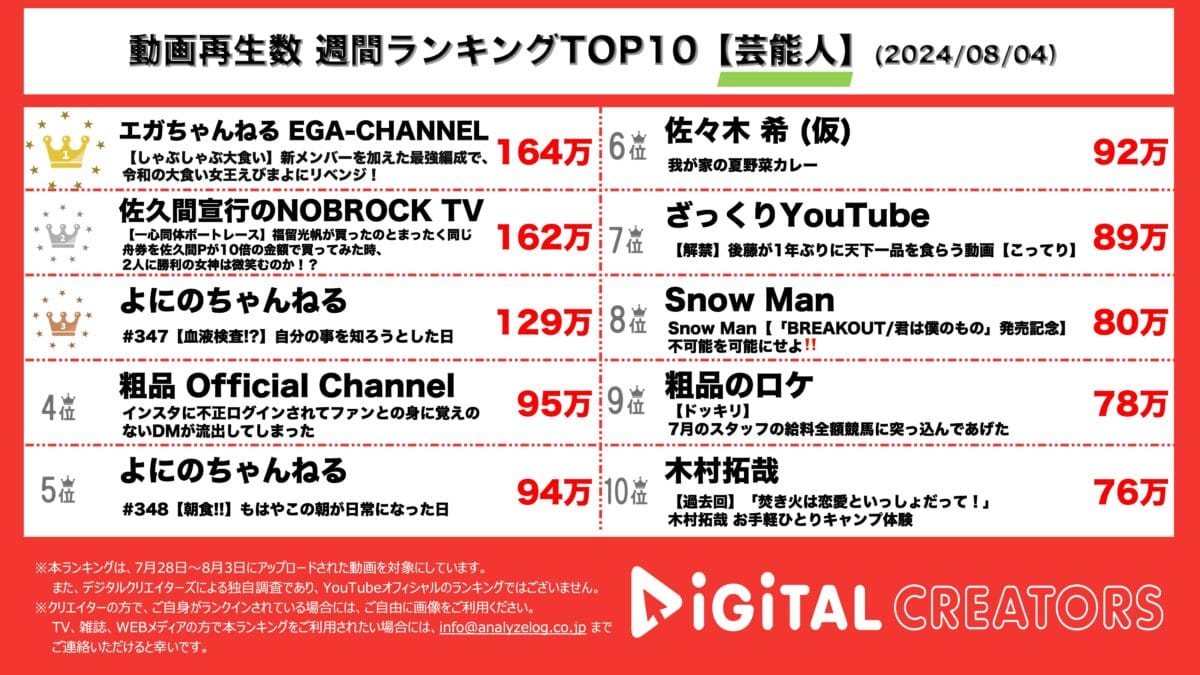 今回は7月28日~8月3日に芸能人のYouTubeチャンネルで公開された動画ランキングTOP10を発表。(8月4日集計)