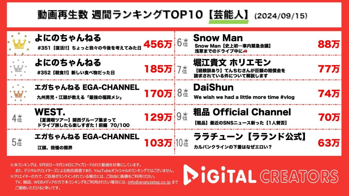 よにのちゃんねる、復活動画が450万再生越え!エガちゃんねる、動画2本ランクイン!Snow Man、WEST.、ホリエモンも!【週間YouTube芸能人ランキング】